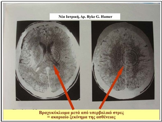 Ο Δρ Hamer ανακάλυψε την ύπαρξη «ασφαλειών», όπως σε ένα ηλεκτρικό κύκλωµα, δηλαδή κέντρων διαταγών στον εγκέφαλο, που κατευθύνονται προς τα διάφορα όργανα του σώµατος. Αυτά τα κέντρα εµφανίζονται αποδεικτικά στα εγκεφαλικά σκάνερ σαν οµόκεντροι κύκλοι, σαν κύµατα-σοκ που δηµιουργούνται στιγµιαία µαζί µε τα στρες, πάντα στην ίδια θέση για το κάθε όργανο που πάσχει, χωρίς καµία εξαίρεση.