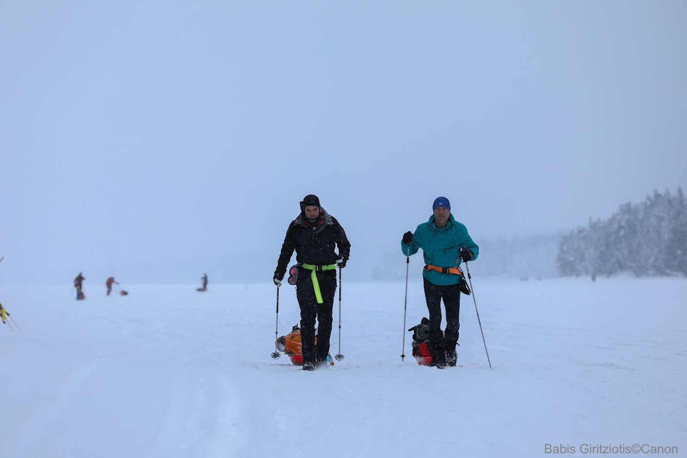 Οι αθλητές σέρνουν ένα έλκηθρο με τον απαραίτητο υποχρεωτικό εξοπλισμό που θα χρησιμοποιήσουν σε περίπτωση εγκατάλειψης και ακραίων καιρικών συνθηκών.